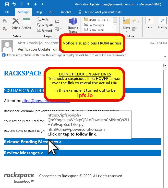 The point is – cybercriminals count on the familiarity factor. For example, if your email is hosted with Rackspace, you are more likely to trust the alert notification from Rackspace. If you have an account with a credit card company, you are likely to believe that message may be legitimate.